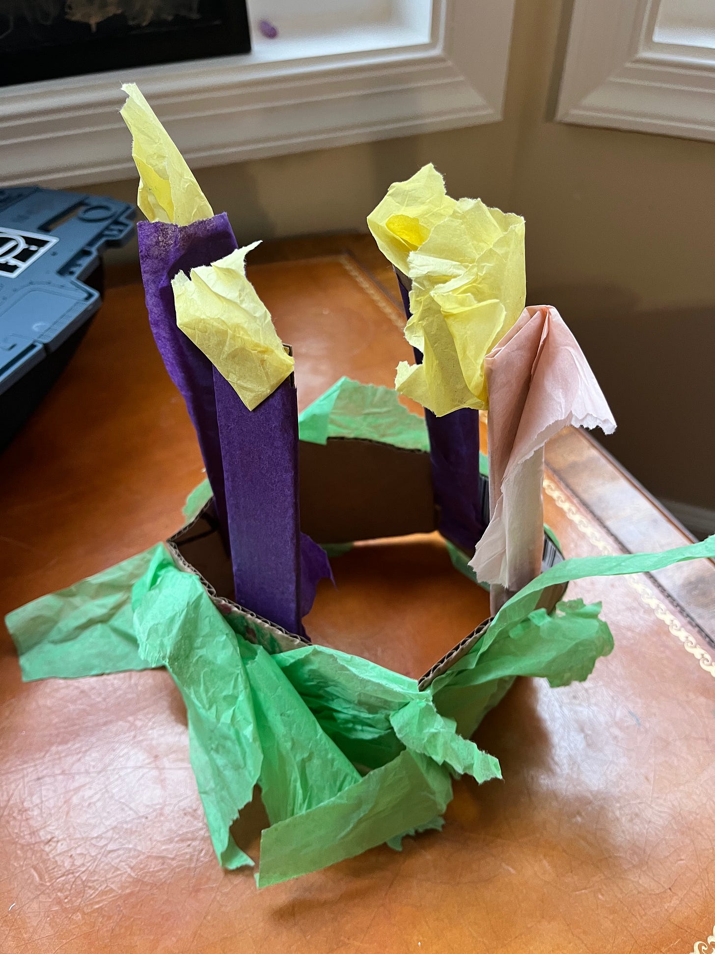 I am adamantly not a crafty mom and my toddler is not a particularly crafty toddler (he’s more process than product-oriented anyway so he usually loses interest in any intentional “project”). I bought a gorgeous Advent wreath from His Girl Sunday a few years ago and I plop it on a cute little fake greenery wreath from Aldi, so I am not team “forage for evergreens” for this purpose. However, so that we could still engage with the Advent wreath in a more child-appropriate tactile way, I overcame my anti-craftiness this one time and got creative. Using random junk that was out and in the way anyway (tissue paper from some baby gifts, cardboard from amazon boxes, plus a random glue stick I found tucked away in a closet) toddler and I put together a fun simulacrum of the more elegant wreath on the dining room table. It took barely 10 minutes to make, and it is easy enough to recreate next year that I can throw it out at the end of the season guilt-free! We have gotten great mileage out of this craft–it’s been worn as a hat a la St. Lucy, decorated various surfaces, and provided ample fodder for hands-on conversations about liturgical colors.