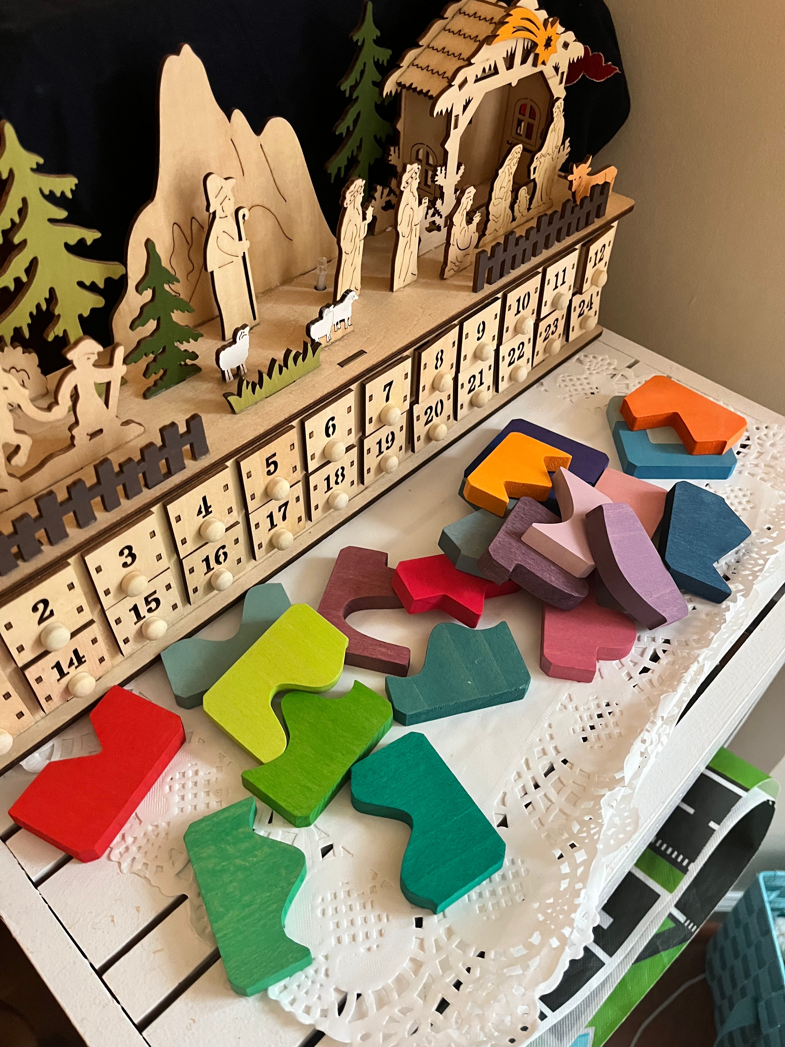 My son’s newfound interest in puzzles prompted the idea of a 24-piece puzzle spread out across the days of December. This year, after hours of neurotically shopping on waldorf-y websites, I finally selected a gorgeous specimen.1 Did my son lose the first piece on the first day and I eventually found it in…a torn envelope that fell out of our personal property tax notification? yes.2 Has fiddling around with each successive piece and seeing the colorful shapes multiply each day been a fantastic and fruitful activity that maintains some continuity during an otherwise chaotic Advent season? definitely yes! You can easily find 24-piece puzzles at all price points and materials (here’s a Bluey puzzle that you can grab for next year at Five Below).